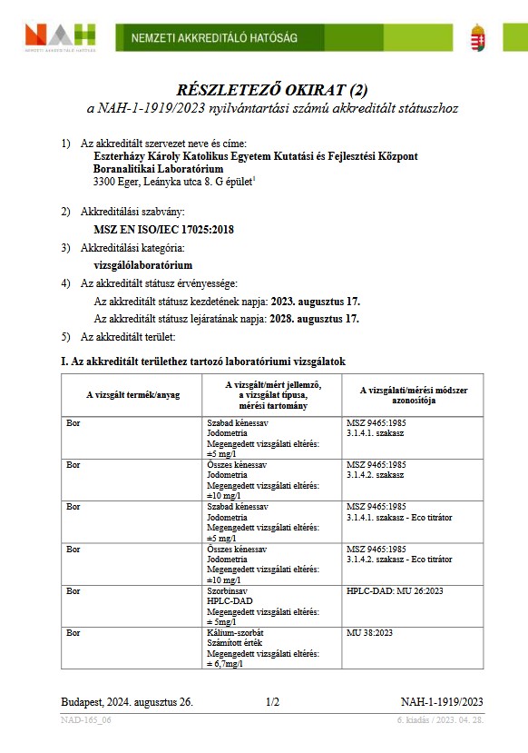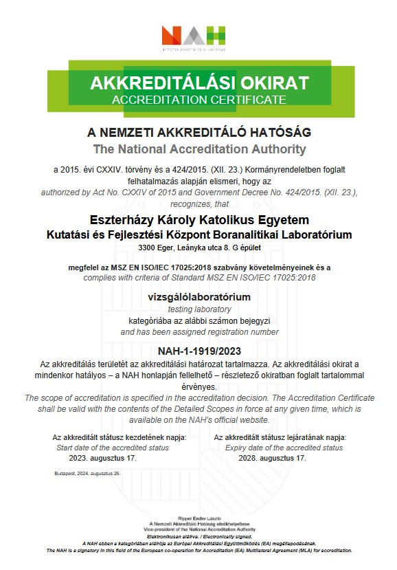 A NAH által NAH-1-1919/2023 számon akkreditált vizsgálólaboratórium.